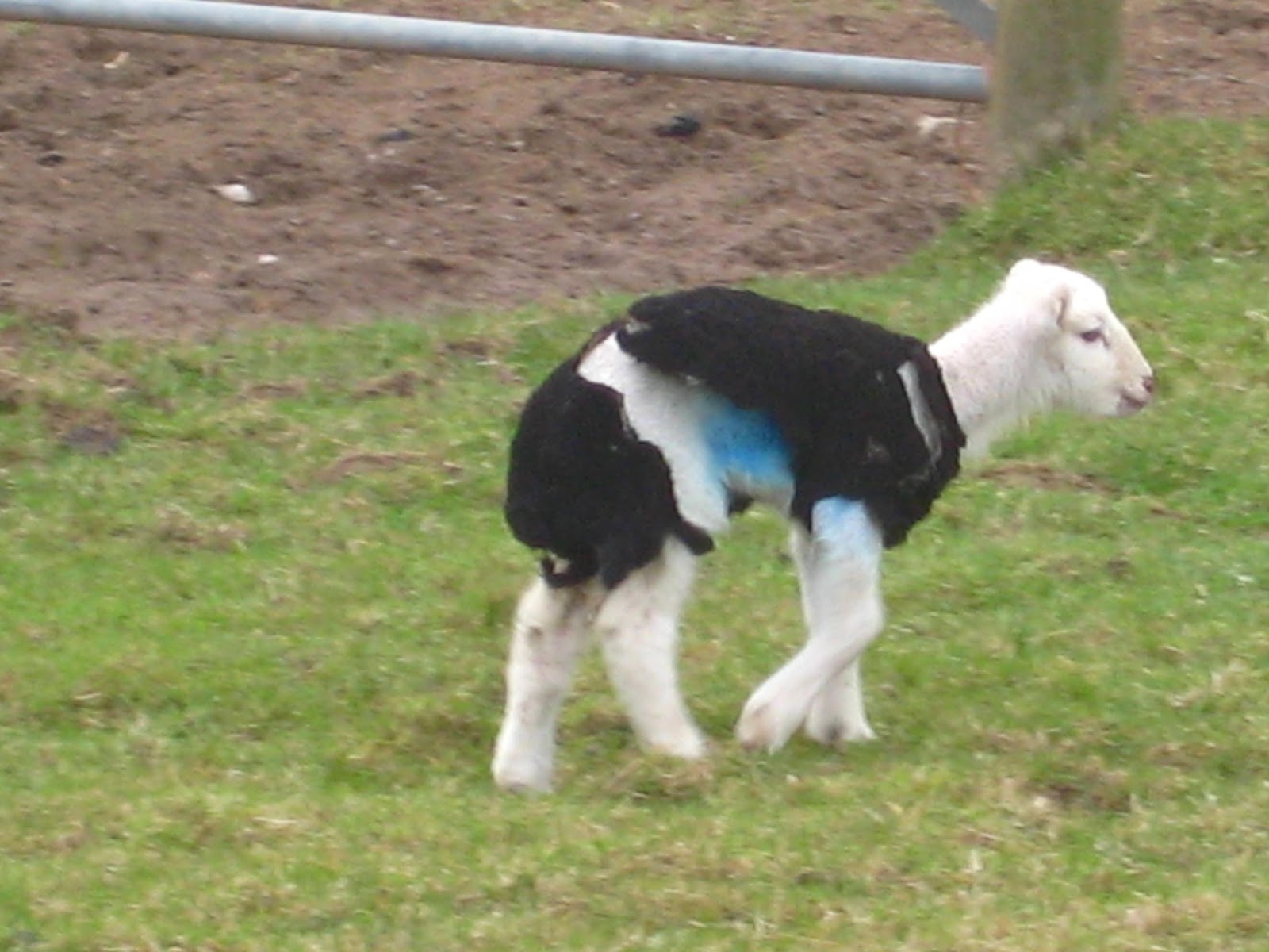 The Jacob sheep was so pleased to have a lamb she recognised by its smell put back with her. Quickly the little lamb wearing his coat found mother’s teat. Warm nourishing milk was in plentiful supply.